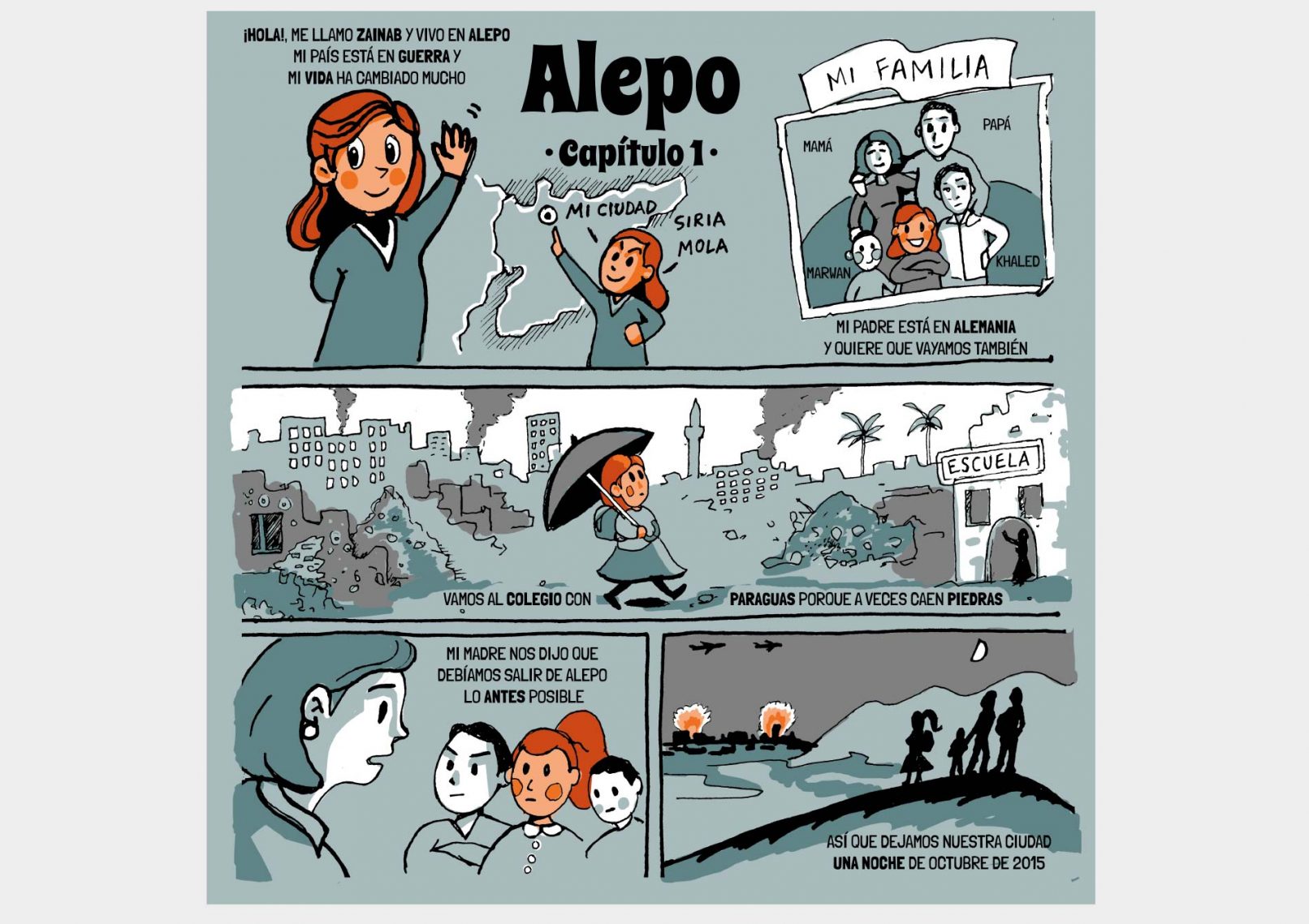 Este cómic quiere visibilizar el éxodo de Zainab y su familia que, como otros 11 millones de personas, se han visto obligadas a abandonar su hogar desde que en 2011 comenzó la guerra en Siria.