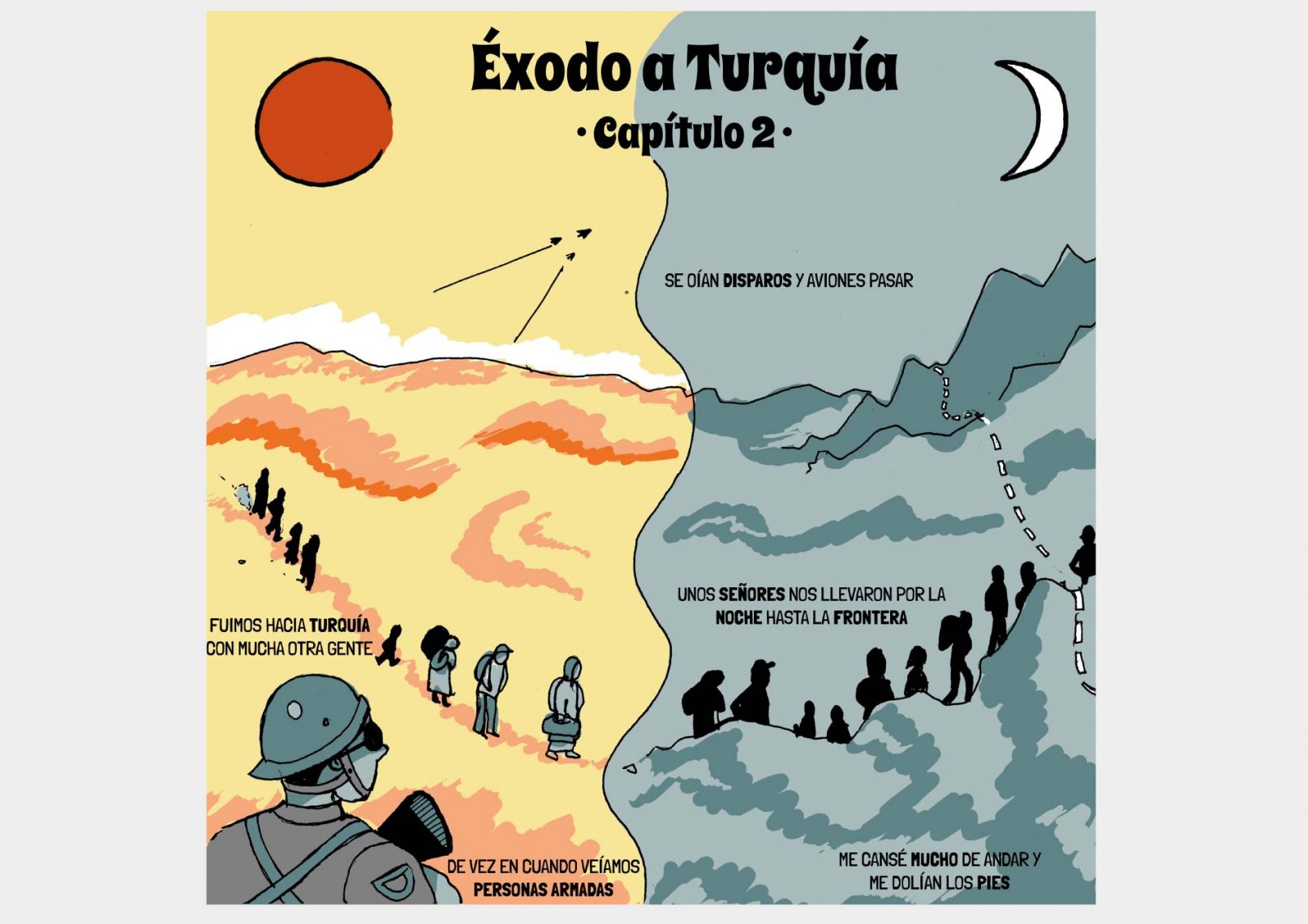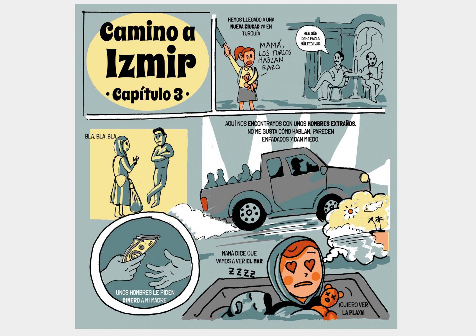 Quisimos narrar el viaje de una familia siria, con la visión de una menor de 11 años, Zainab, contando su experiencia a través de un cómic, combinándolo con los datos clave que ponen en contexto el viaje (infografías).