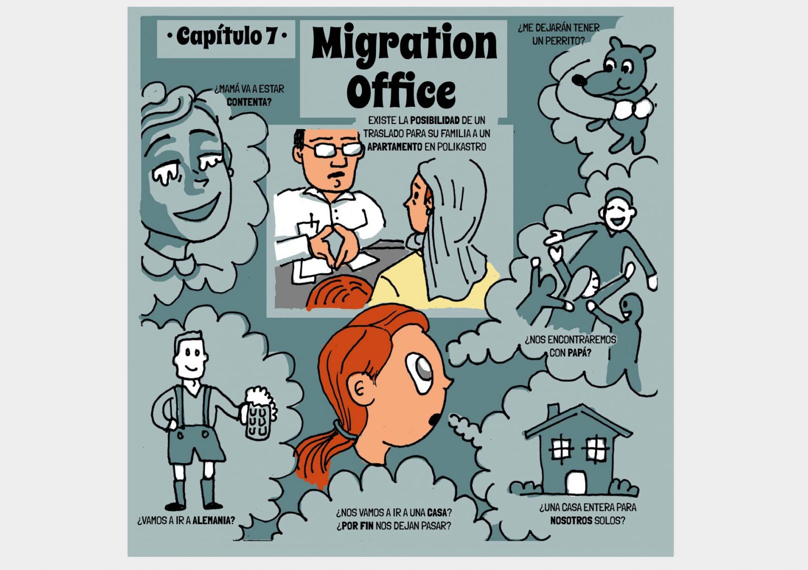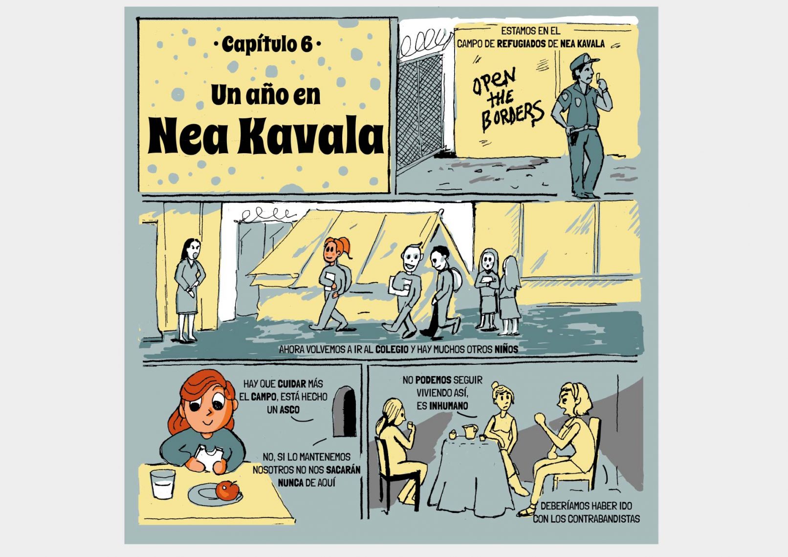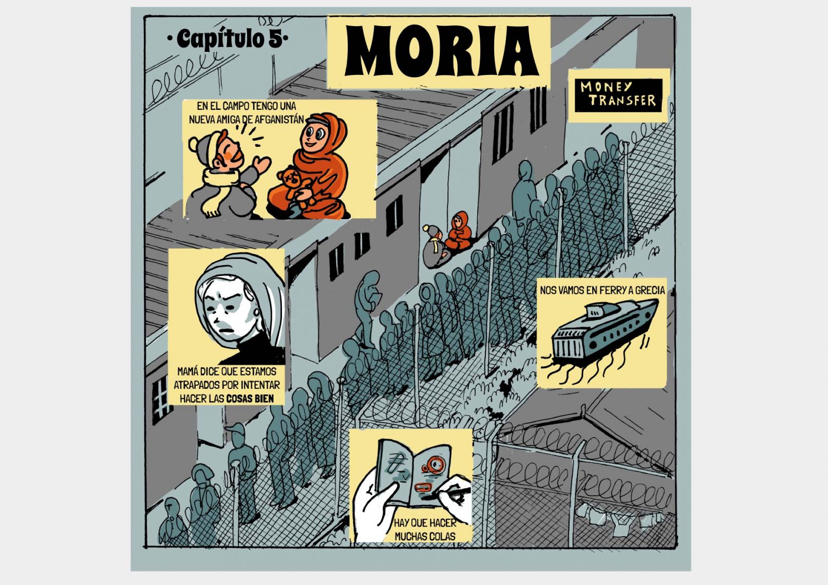 La historia transcurre en 7 capítulos, adjuntamos en cada capitulo las referencias de todos datos. En último capítulo realizamos un resumen de todo su trayecto, explicando la burocracia para pedir asilo y destacando el no lugar de Grecia para muchas familias Sirias.